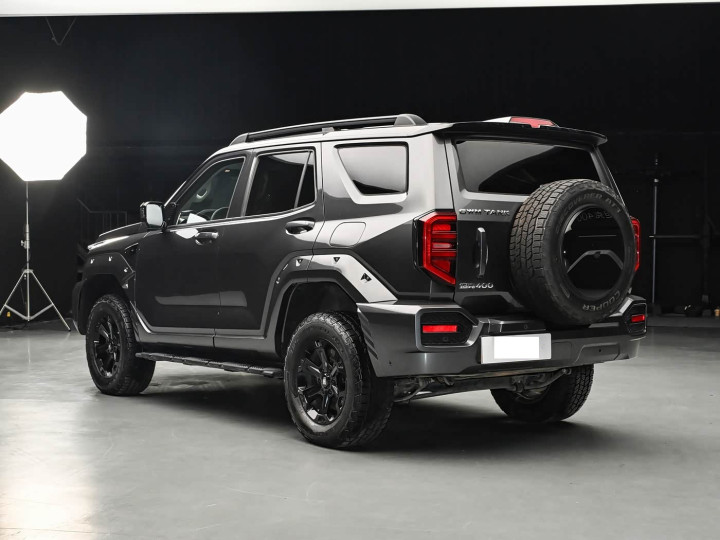 再来看车身侧面部分,新车4985mm车长与2850mm轴距构成标准方盒子造型,风刃腰线从前轮眉贯穿至车尾,配合向外凸出的铆钉轮拱展现肌肉感。车顶行李架与侧裙防擦条采用一体化设计,18英寸熏黑轮毂搭配265/65 R18全地形轮胎,离地间隙达224mm。双侧电动踏板在开启时自动展开,但铆钉装饰件存在轻微剐蹭风险。尺寸方面,新款坦克400长宽高分别为4964/1970/1905毫米,轴距2850毫米,车长相比在售车型缩短21毫米,宽度增加10毫米,高度增加5毫米,轴距保持一致。